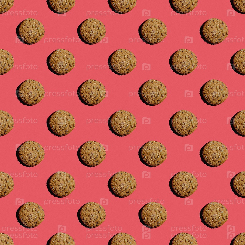 Бесшовный узор из изображений печенья с семенами на розовом фоне. Обои с печеньем. Хорошо использовать для обоев, текстиля, фона, плаката, обложки, открытки