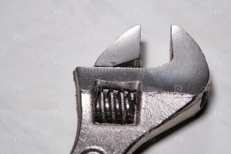 Фрагмент разводного ключа на светлом фоне. Крупный план. Выборочный фокус