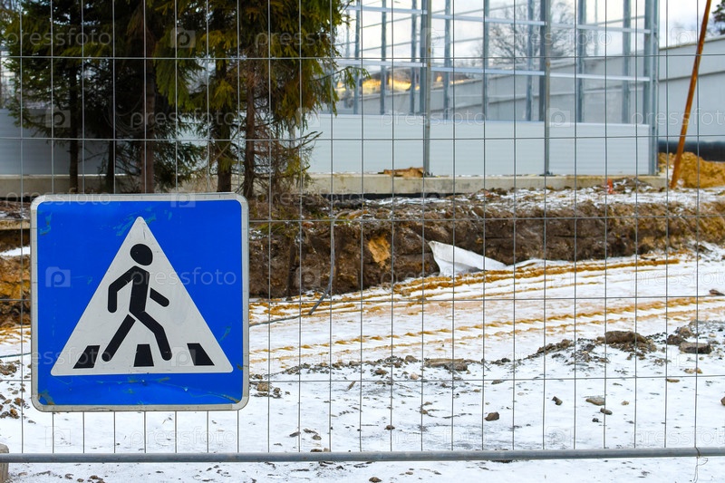 Знак пешеходного перехода на фоне строительных работ по ремонту дороги