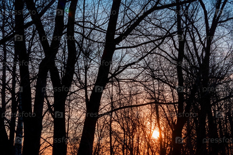 Силуэты деревьев в лесу на фоне яркого неба и заката. Красивый абстрактный мистический пейзаж