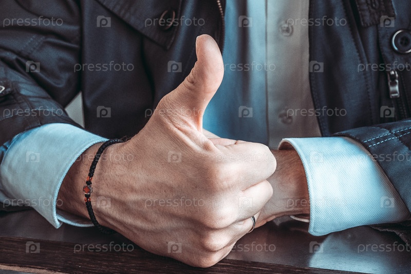 Правая мужская рука с четками на запястье и поднятым вверх большим пальцем. Крупный план