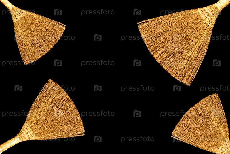 Натуральные веники в хаотичном порядке. Изолировать на черном фоне. Концепция очистки. Место для надписей и дизайна