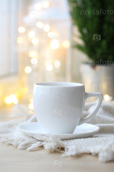 Кофейная чашка на фоне рождественской гирлянды
