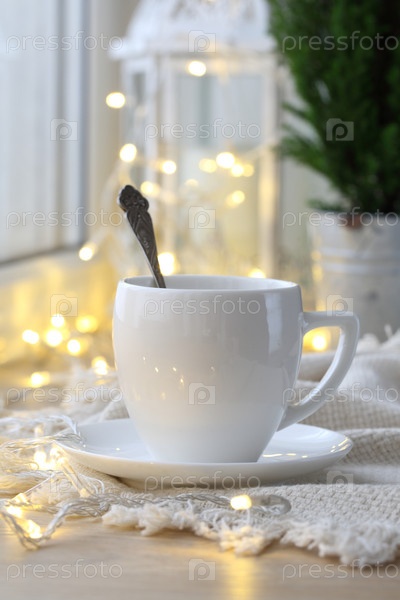 Кофейная чашка на фоне рождественской гирлянды