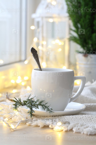 Кофейная чашка на фоне рождественской гирлянды