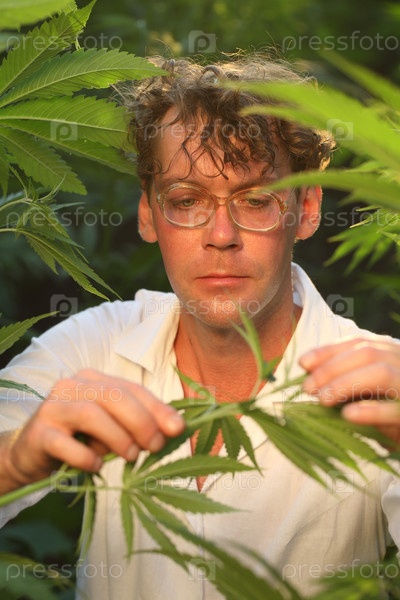 Ученый биолог работает в конопляном поле