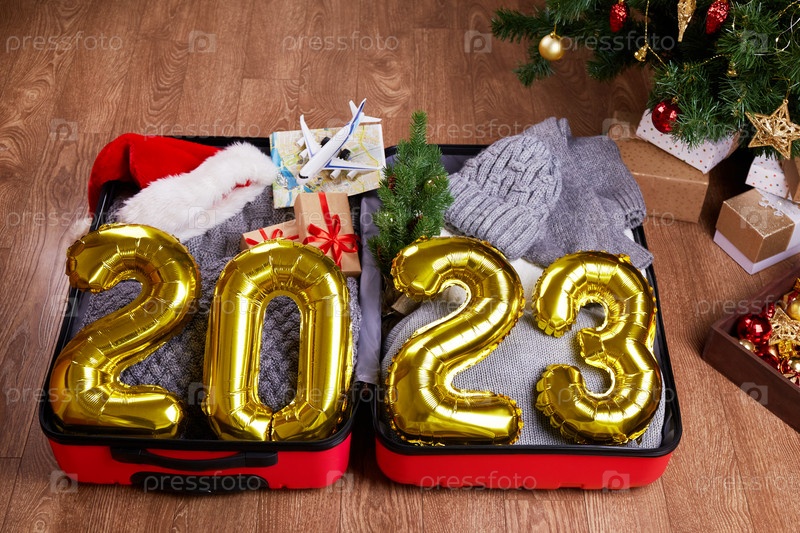 С Новым 2023 годом. Золотые шары с цифрами. Открытый чемодан