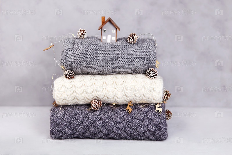 Стопка сложенных вязаных свитеров, игрушечный деревянный домик, рождественские украшения