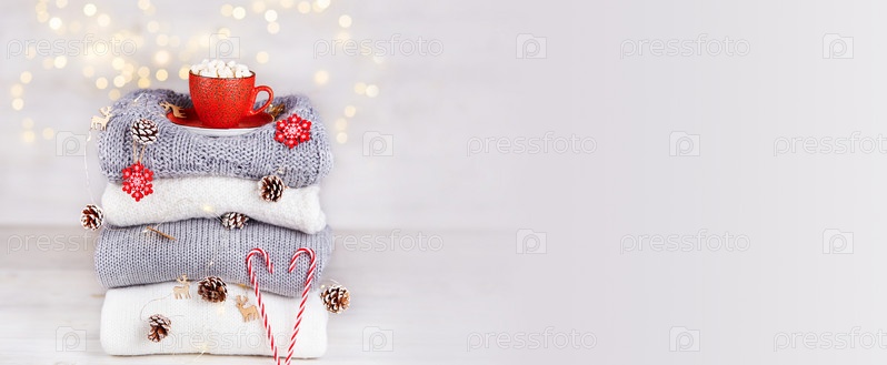 Стопка вязаных свитеров или шарфов, чашка какао с зефиром