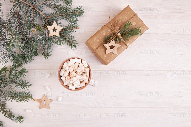 Рождественский праздник фон. Еловые ветки, кружка какао или горячего шоколада