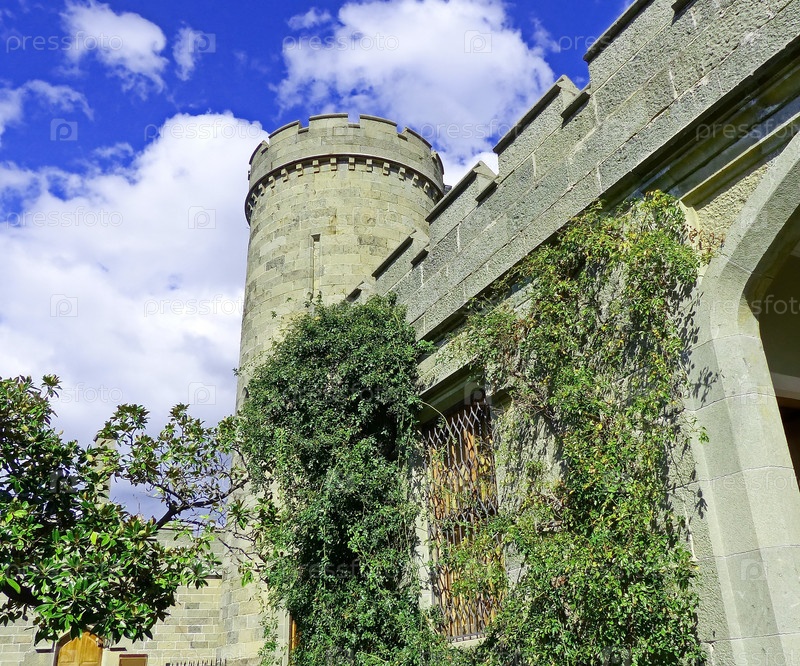 Ветви магнолии на фоне старой каменной башни. Башня западного входа в Воронцовский (Алупкинский) дворец - памятник романтизма, построенный в 1828-1848 годах. Южный берег Крыма