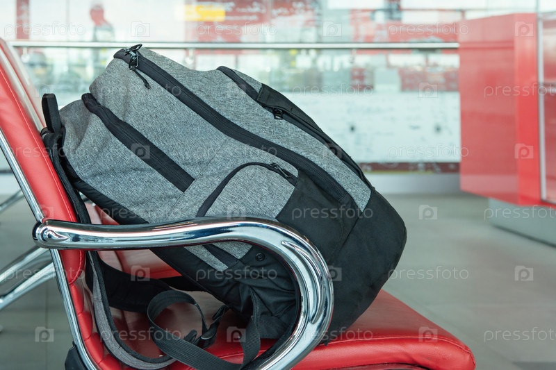 Одинокий рюкзак в аэропорту в зале ожидания. Забытый багаж. Потеря ручной клади