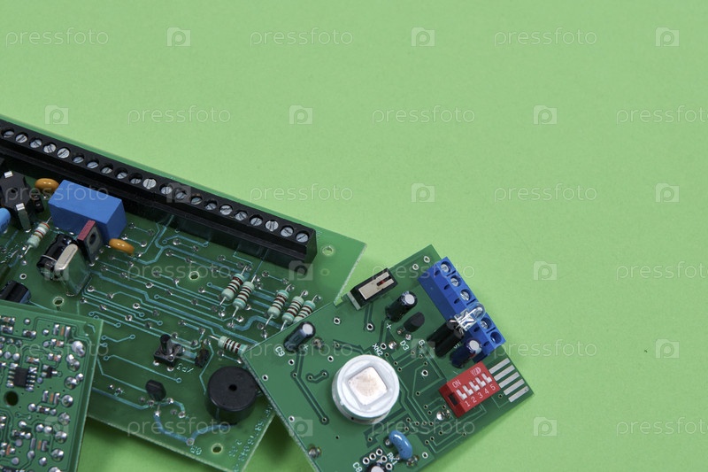 Электронные печатные платы на зеленом фоне. Утилизация электронных отходов и ремонт сломанной техники