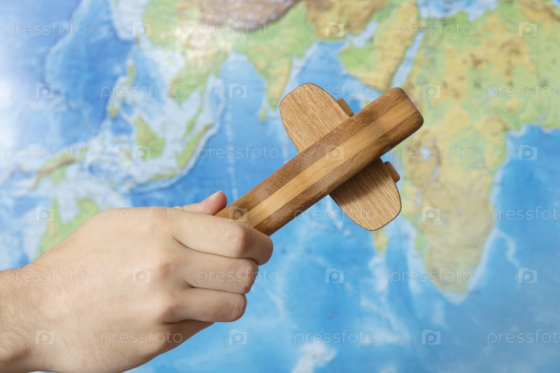 Мужская рука держит деревянную игрушечную модель самолета на фоне карты мира. Концепция путешествия и отдыха. Самолет летит на фоне моря и земли