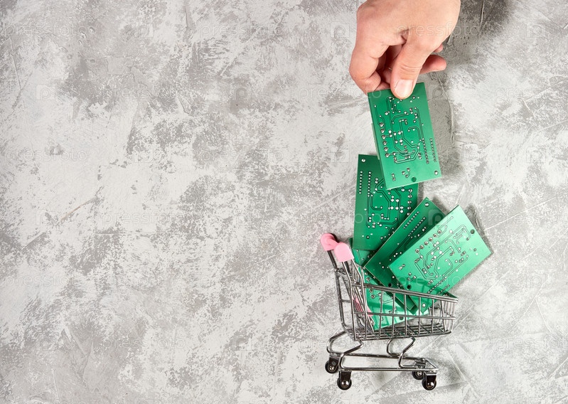 Электронные печатные платы на зеленом фоне. Переработка электронных отходов