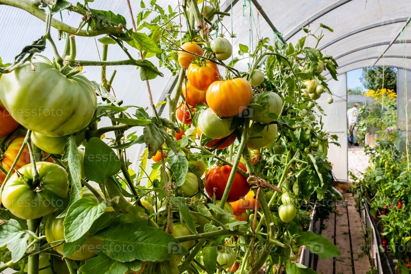 Спелые красные и незрелые зеленые помидоры в теплице