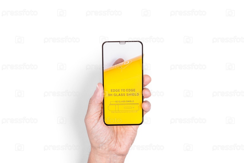 Рука держит защитный экран для мобильного телефона. Белый фон. Крупный план