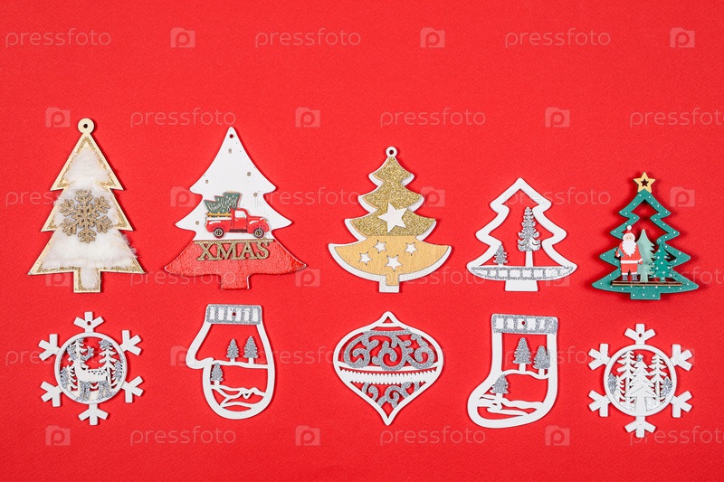 Новогодние игрушки, украшения для елки на красном фоне