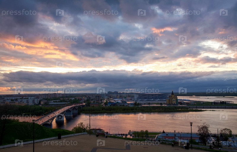 Розовый закат в Нижнем Новгороде. Набережная Федоровского. Стрелка - собор Александра Невского, стадион. Канавинский мост