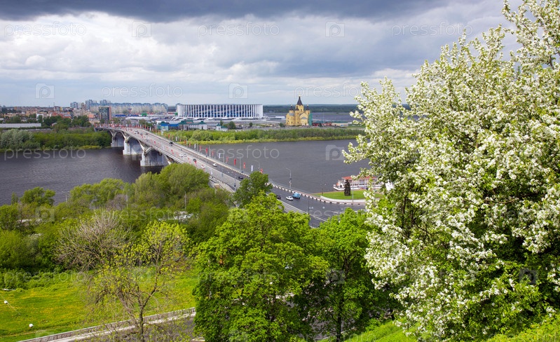 Цветущие деревья на набережной Федоровского и вид на весенний Нижний Новгород. Канавинский мост. Стрелка - собор Александра Невского, стадион