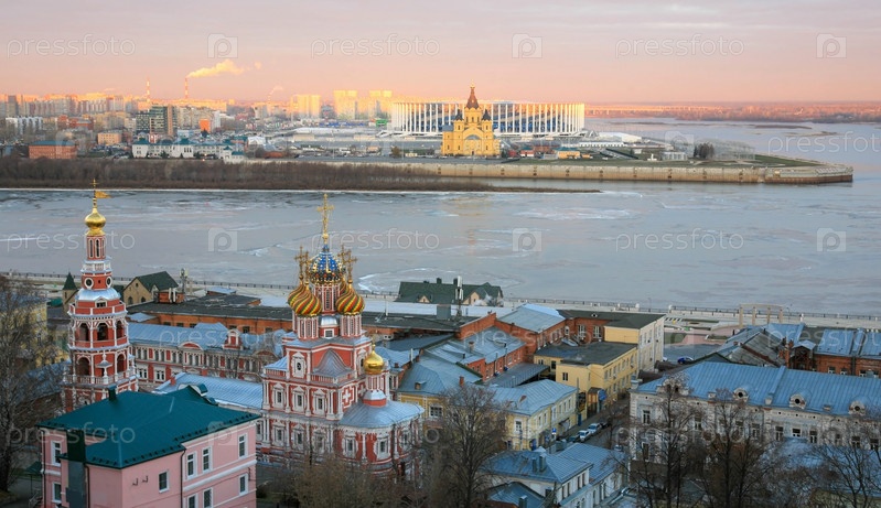 Вид на красивый Нижний Новгород на рассвете ранней зимой. Рождественская церковь на набережной Федоровского. Стрелка - собор Александра Невского, стадион
