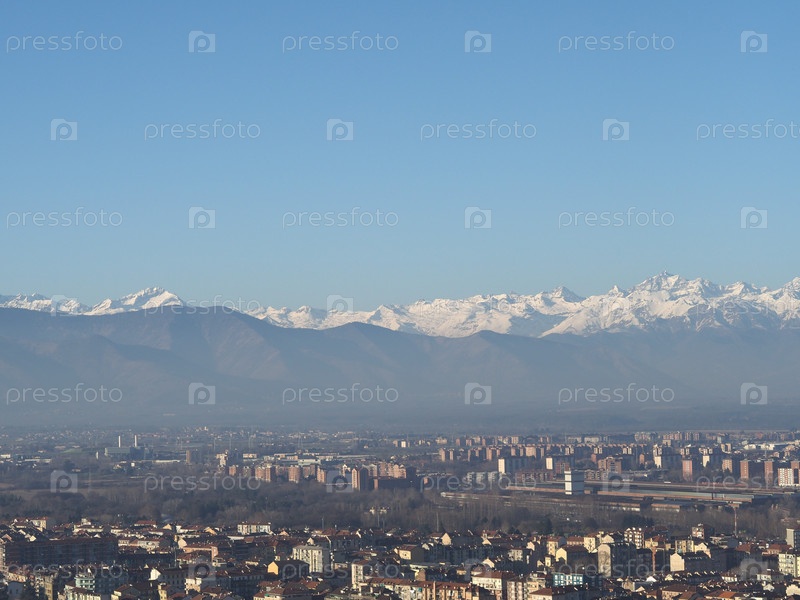 Вид с воздуха на город Турин, Италия с горным хребтом Альп на заднем плане
