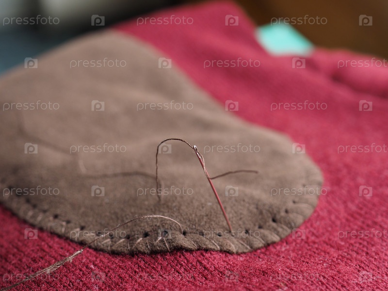 Деталь шитья нашивки с избирательным фокусом на игольном ушке