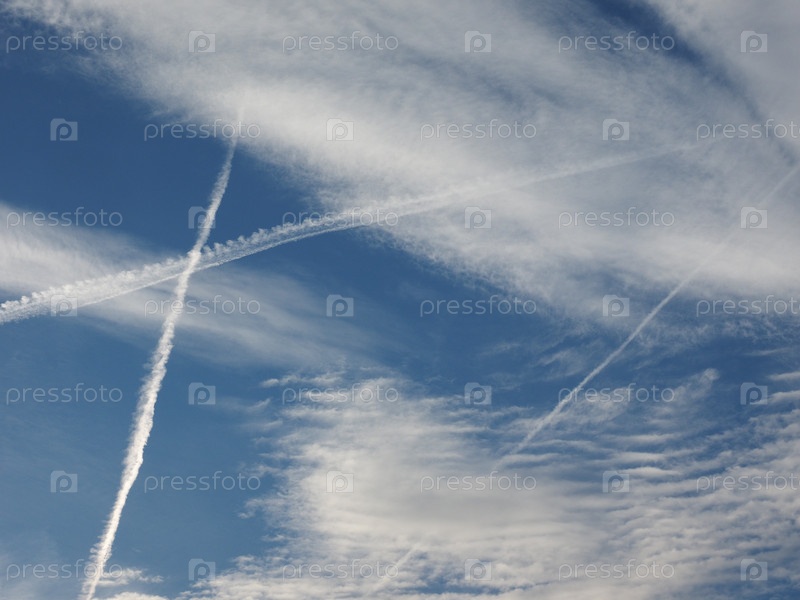 Голубое небо со следами паров самолетов (они же инверсионные следы, сокращенно от следов конденсации)