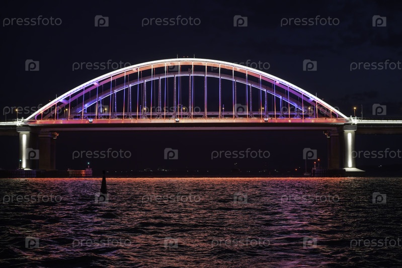 Морской пейзаж с видом на Крымский мост в ночном освещении