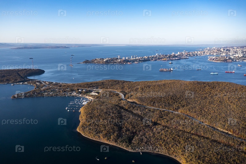 Вид с воздуха на остров Русский и Владивосток, Россия