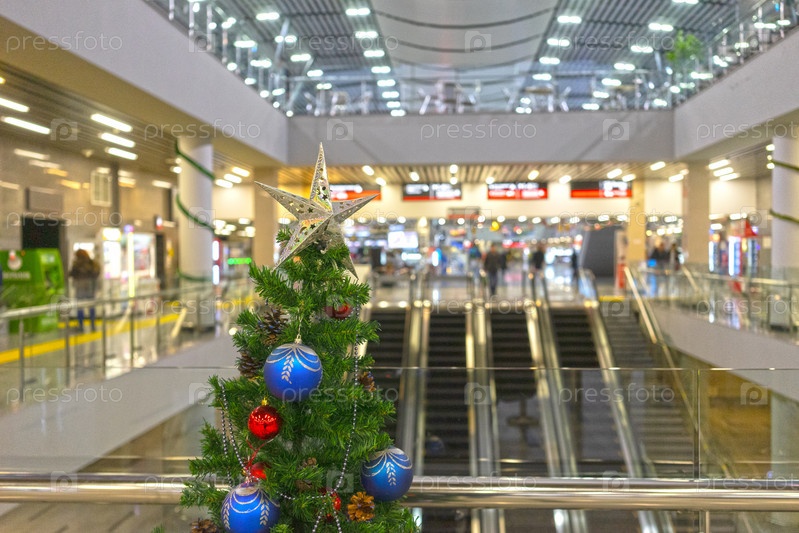 Рождественская елка на размытом фоне железнодорожного вокзала