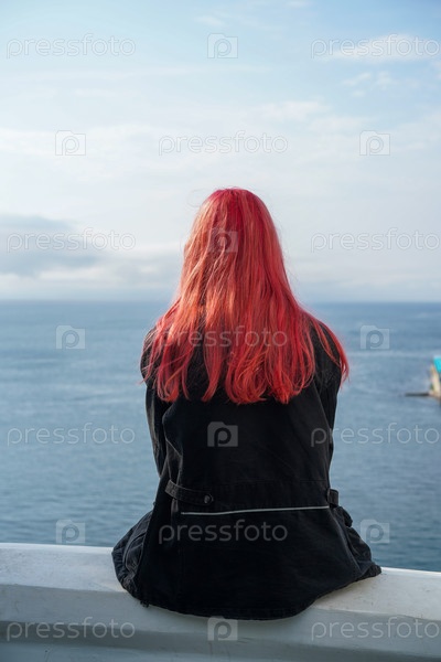 Девушка с розовыми волосами сидит спиной к морю