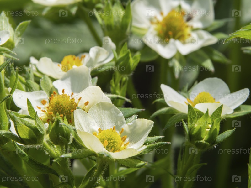 Маленькие белые цветы в солнечном свете на фоне зелени. Крупный план цветка клубники, выборочный фокус