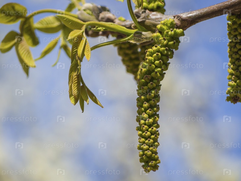 Цветы грецкого ореха крупным планом на фоне облачного неба