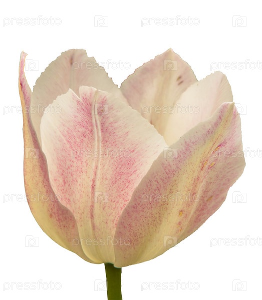 Бутон белого тюльпана с розовыми крапинками, выделенный на белом фоне. Крупный план натурального бело-розового цветка тюльпана. Красивый весенний цветок для дизайна