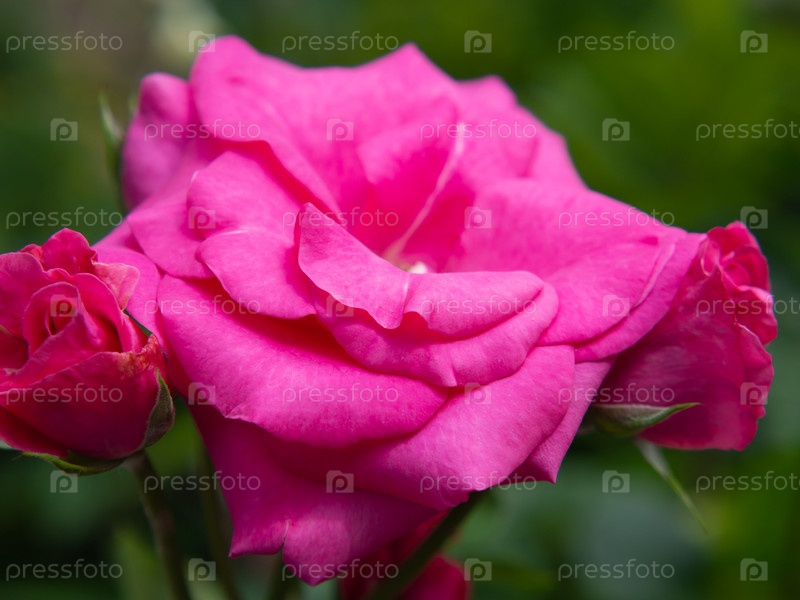 Букет розово-красных роз на зеленом фоне летнего сада. Малиновая роза на фото макроса сада. Соцветие розы на солнце в саду на фоне зелени