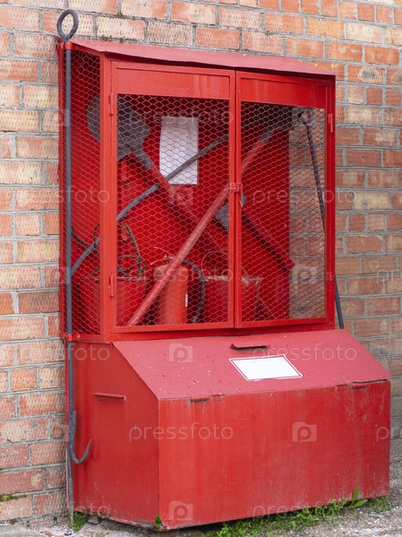 Щит огнезащитный. Инструменты для ручного пожаротушения на красном щите - лопата, ведро, огнетушитель, топор, крюк и ящик с песком - у стены здания