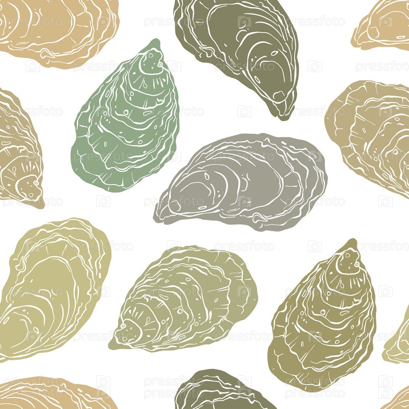 Устрицы. Векторные бесшовные фоновые узоры на белом. Пищевая векторная иллюстрация. Шаблоны для дизайна меню, упаковки, ресторанов и кейтеринга. Нарисованные от руки изображения. Идеально подходит для обоев, обертывания, ткани и текстиля