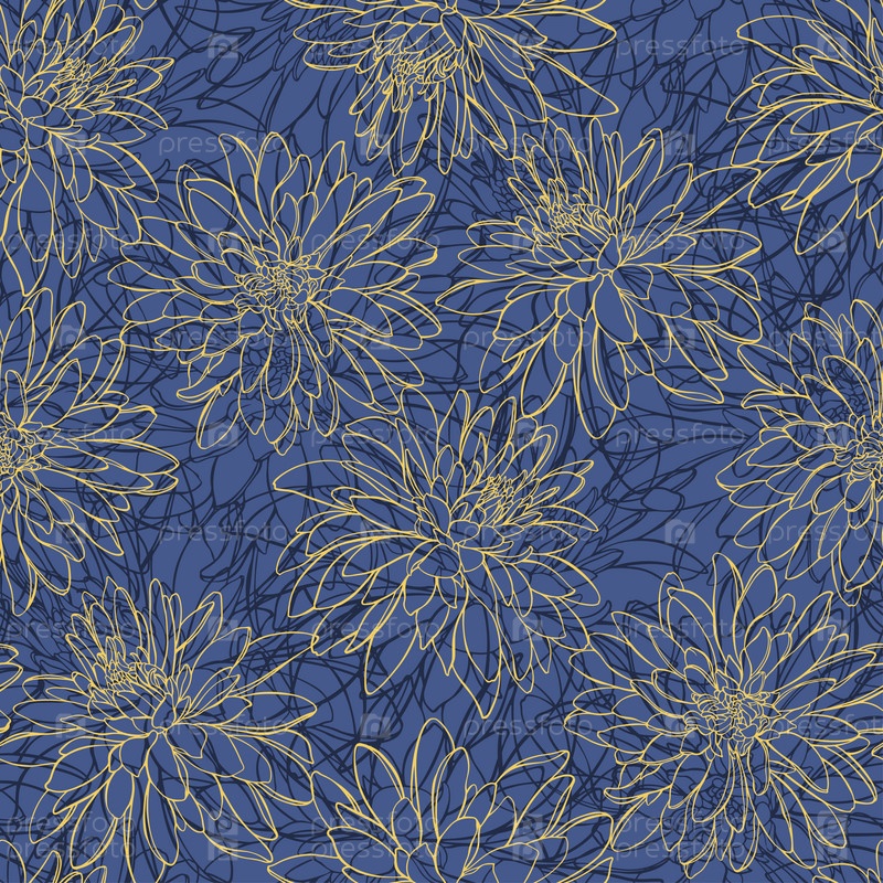 Бесшовный векторный рисунок с цветами на синем. Рудбекия, Золотые шары. Цветочный фон. Линейное искусство. Идеально подходит для обоев, обертывания, ткани и текстиля