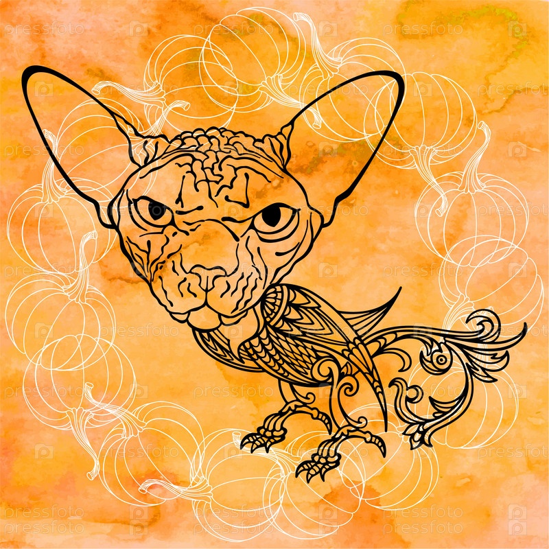 Открытка на Хэллоуин с кошкой мифического существа, тыквы на оранжевом акварельном фоне. Вектор. Концепция украшения Хэллоуина. Векторная компоновка декоративной открытки, приглашения, дизайн фона, плаката, приглашения