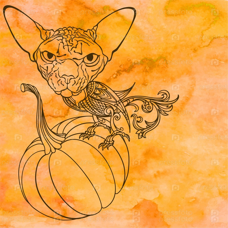 Фантастический кошачий персонаж сидит на тыкве. Векторная иллюстрация с местом для текста на оранжевом акварельном фоне. Концепция украшения Хэллоуина. Идеально подходит в качестве элемента дизайна