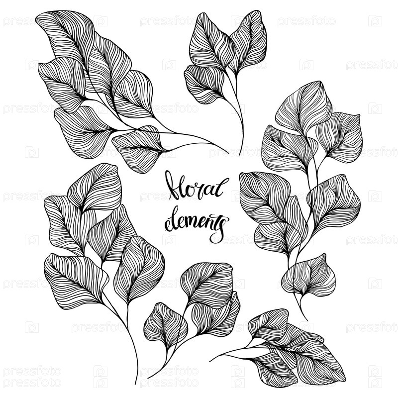 Абстрактные цветочные изолированные элементы. Ручная рисованная векторная иллюстрация на белом. Черное и белое. Идеально подходит для приглашений, поздравительных открыток и в качестве элемента дизайна