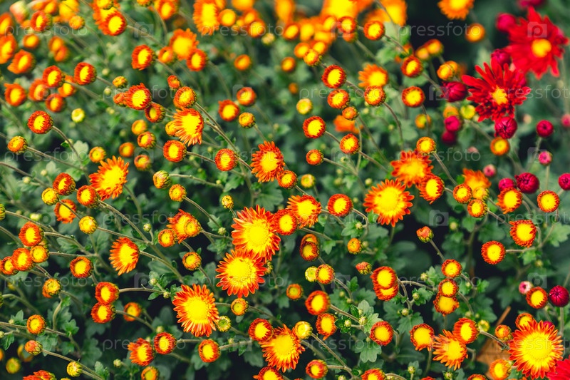 Яркий цветочный фон с большим количеством бутонов и цветов хризантем