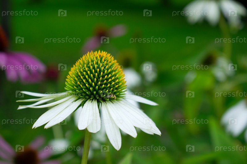 Белый цветок эхинацеи, эхинацея, с пчелой в саду
