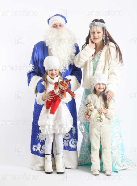 Актеры в костюмах Деда Мороз и Снегурочки в новогодних декорациях