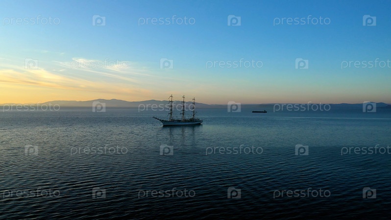 Морской пейзаж с красивым парусником на горизонте