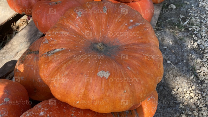 Большие оранжевые тыквы на прилавке уличного рынка