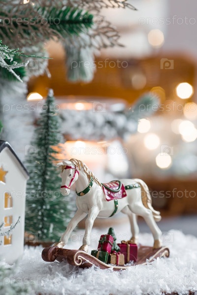 С Новым 2023 годом. Рождественская открытка, баннер с лошадкой-качалкой, елки, подарки и красивое боке на заднем плане. Концепция домашнего зимнего отдыха, тепла и уюта