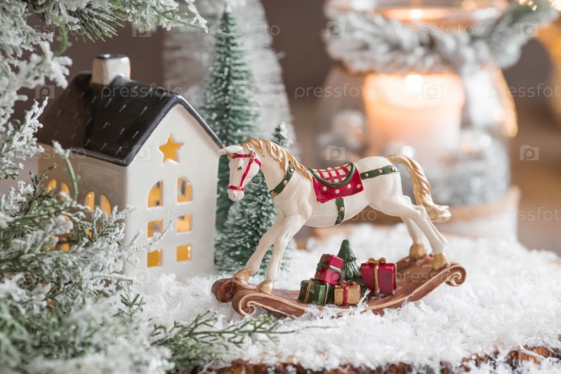 С Новым 2023 годом. Рождественская открытка, баннер с лошадкой-качалкой, елки, подарки и красивое боке на заднем плане. Концепция домашнего зимнего отдыха, тепла и уюта