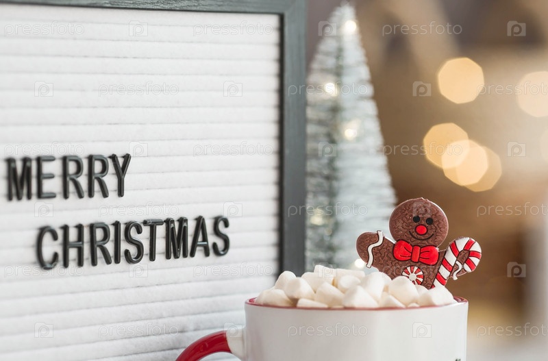 Табличка с надписью "Счастливого Рождества, шляпа Санты, кружка с горячим какао, зефир и пряничный человечек на фоне красивого боке". Уютная концепция Нового года и зимних праздников
